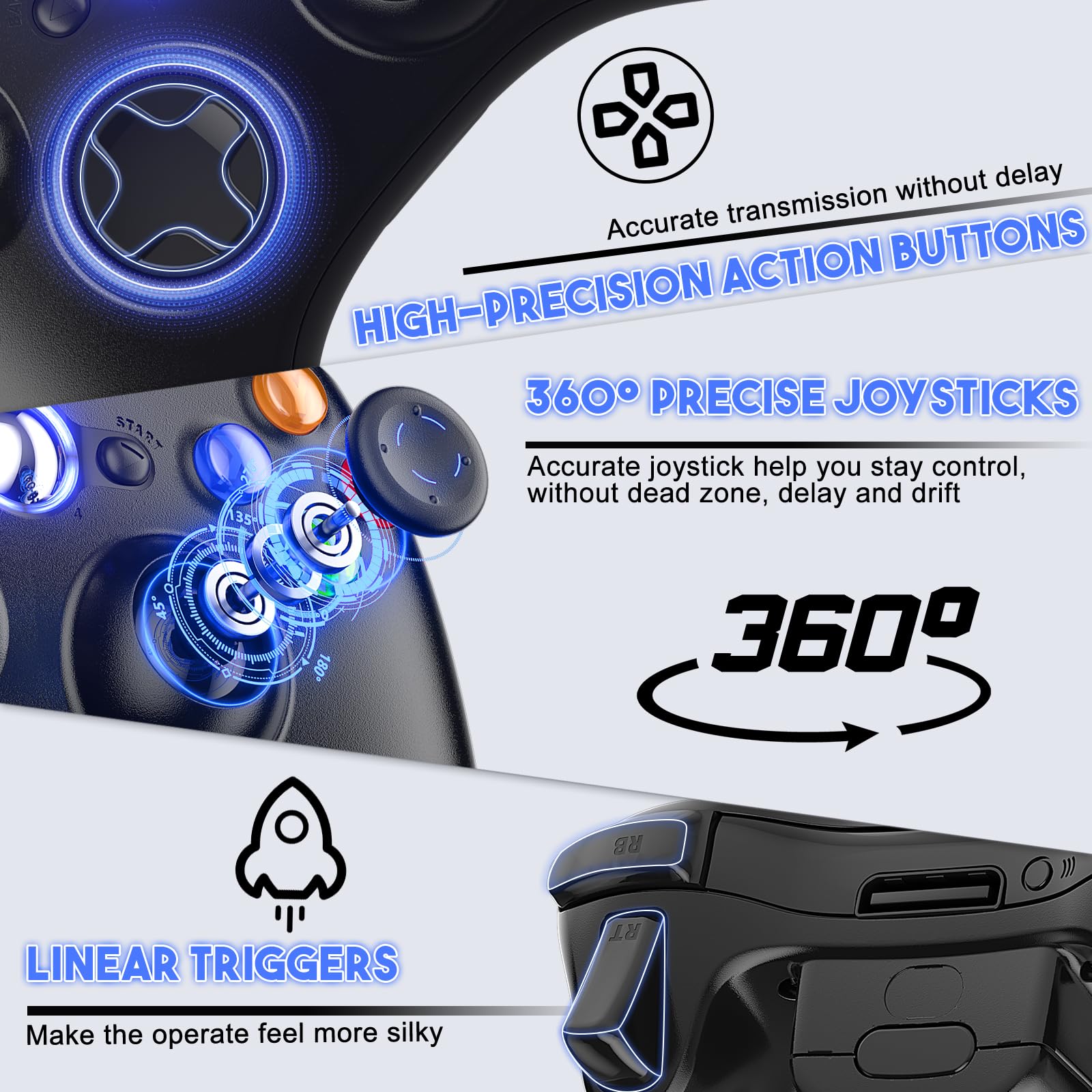 • ✅【Upgraded Version】Xbox 360 Controller Wireless - Support Acceleration/Gravity Sensor, 2.5mm Audio Jack, Double Shock and Upgraded Joystick. Just the same as the joystick of the official wireless 360 controller. Spend less money to enjoy the same sensitivity.